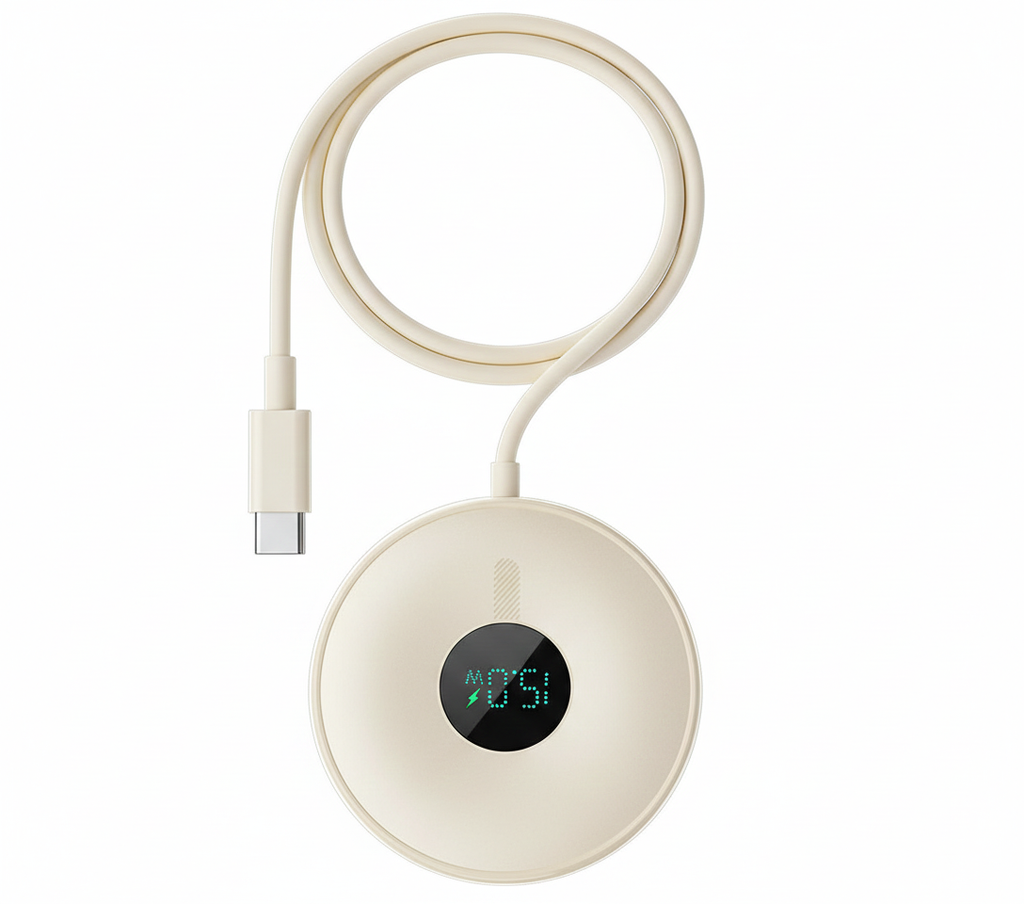 The charger is portable and features a 1m long Type-C cable, making it ideal for use on a desk, nightstand, or while traveling. Made from durable PC material, it is long-lasting, scratch-resistant, and easy to clean. Optimized for everyday use, it provides a stable charging surface for phones, smartwatches, and headphones.