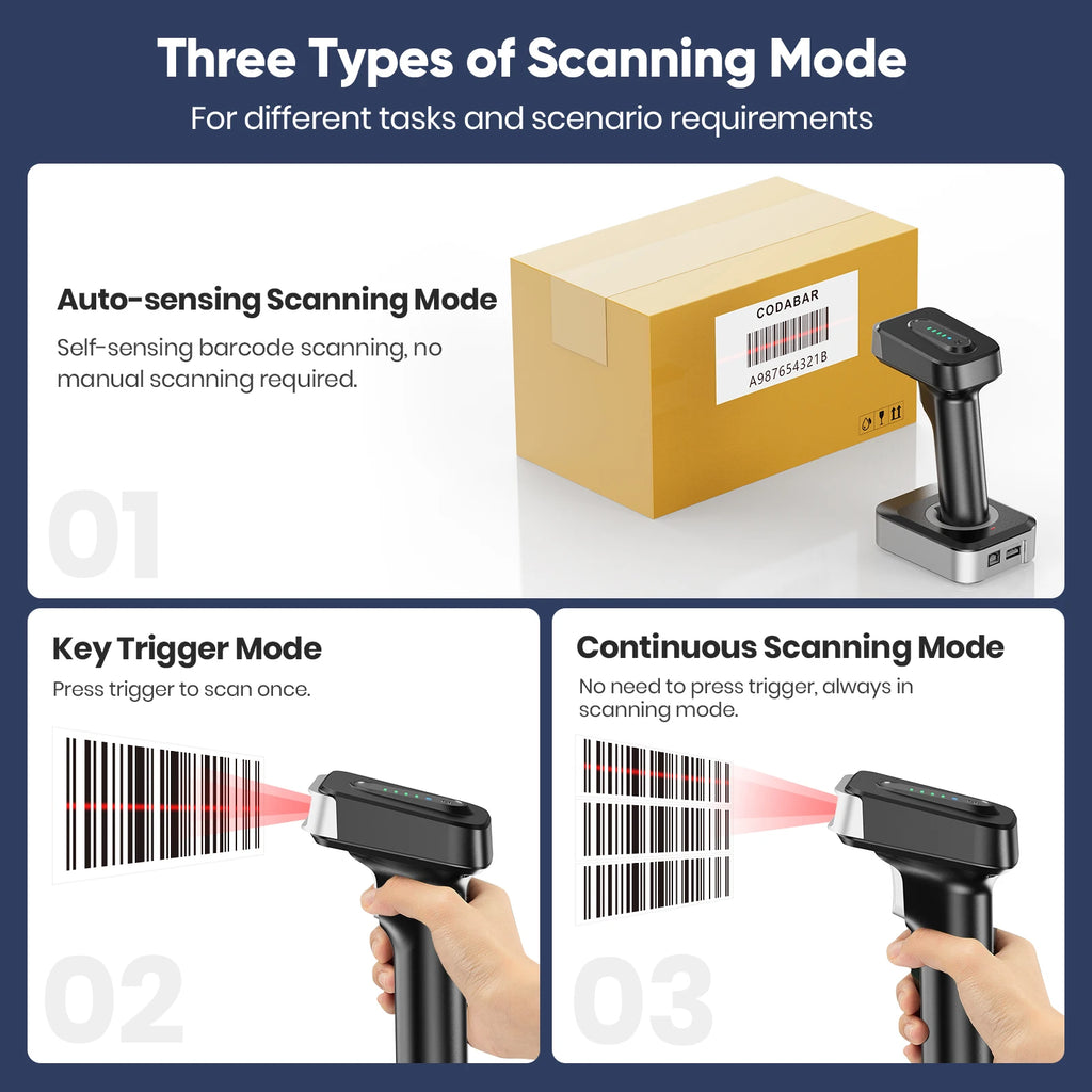 Der Scanner ist kompatibel mit Windows XP/7/8/10, Mac OS, Android, iOS und Linux und funktioniert mit PCs, Laptops, mobilen Geräten, Tablets und POS-Systemen. Er bewältigt auch schwierige Barcodes, wie verschmutzte, zerknitterte oder verblasste Etiketten, und kann bis zu 120 Barcodes pro Minute im manuellen Modus lesen. Die 2500mAh Batterie erlaubt eine kontinuierliche Nutzung von bis zu 8 Stunden und eine Standby-Zeit von bis zu 30 Tagen. Im Offline-Speichermodus können bis zu 100.000 Barcodes gespeichert werden.