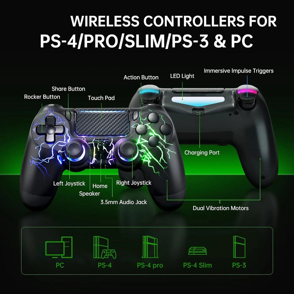 RGB Wireless Controller – Hall-Effekt-Joystick, Dual-Vibration & 6-Achsen-Sensor für PS4, PS4 Pro, PS4 Slim und PC
