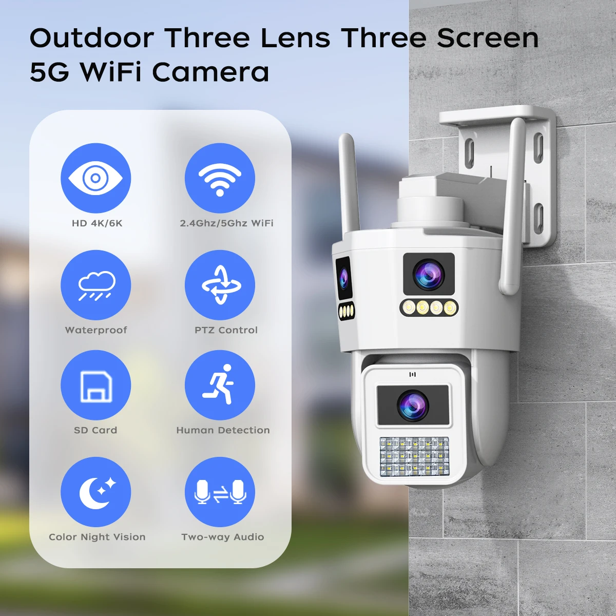 Diese 15MP Drei-Linsen WLAN IP Kamera bietet eine umfassende Überwachungslösung für den Innen- und Außenbereich. Mit drei Objektiven und drei Bildschirmen ermöglicht sie eine breite Abdeckung ohne tote Winkel. Die Kamera unterstützt die menschliche Erkennung sowie horizontales automatisches Tracking, wodurch Bewegungen von Personen zuverlässig verfolgt werden können. Dank Dual-Band WLAN (2,4 GHz und 5 GHz) sowie RJ45-Netzwerkkabel ist eine stabile Verbindung gewährleistet.