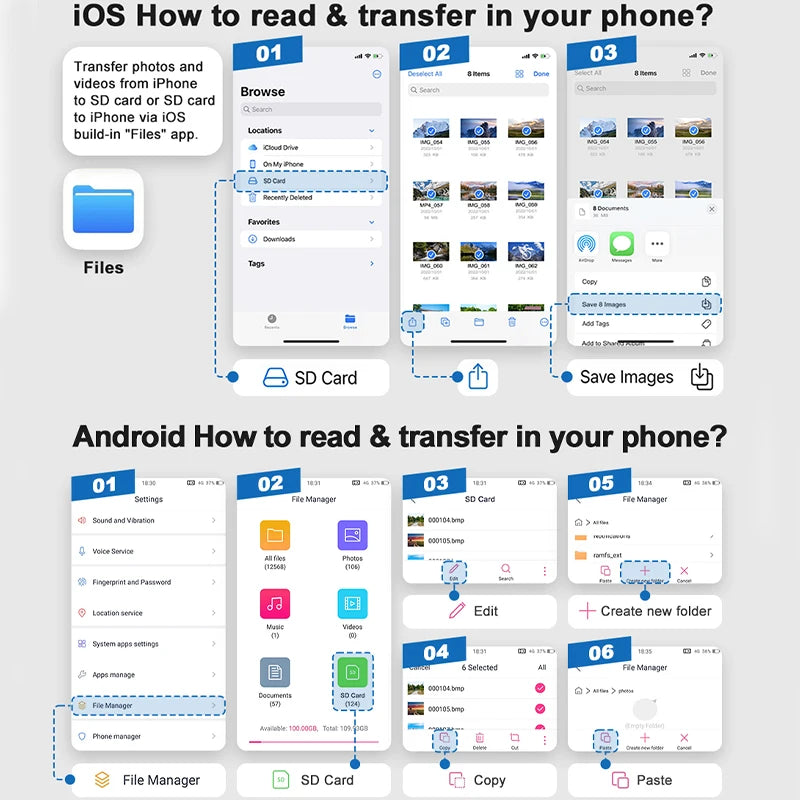 Die schnelle Zwei-Wege-Datenübertragung ist kompatibel mit iOS 12 und höher, iOS 13–16 Geräten sowie Android-Smartphones mit OTG-Funktion. Unterstützt werden SD, SDHC, SDXC, Micro SD, Micro SDHC, Micro SDXC Karten bis 512 GB.