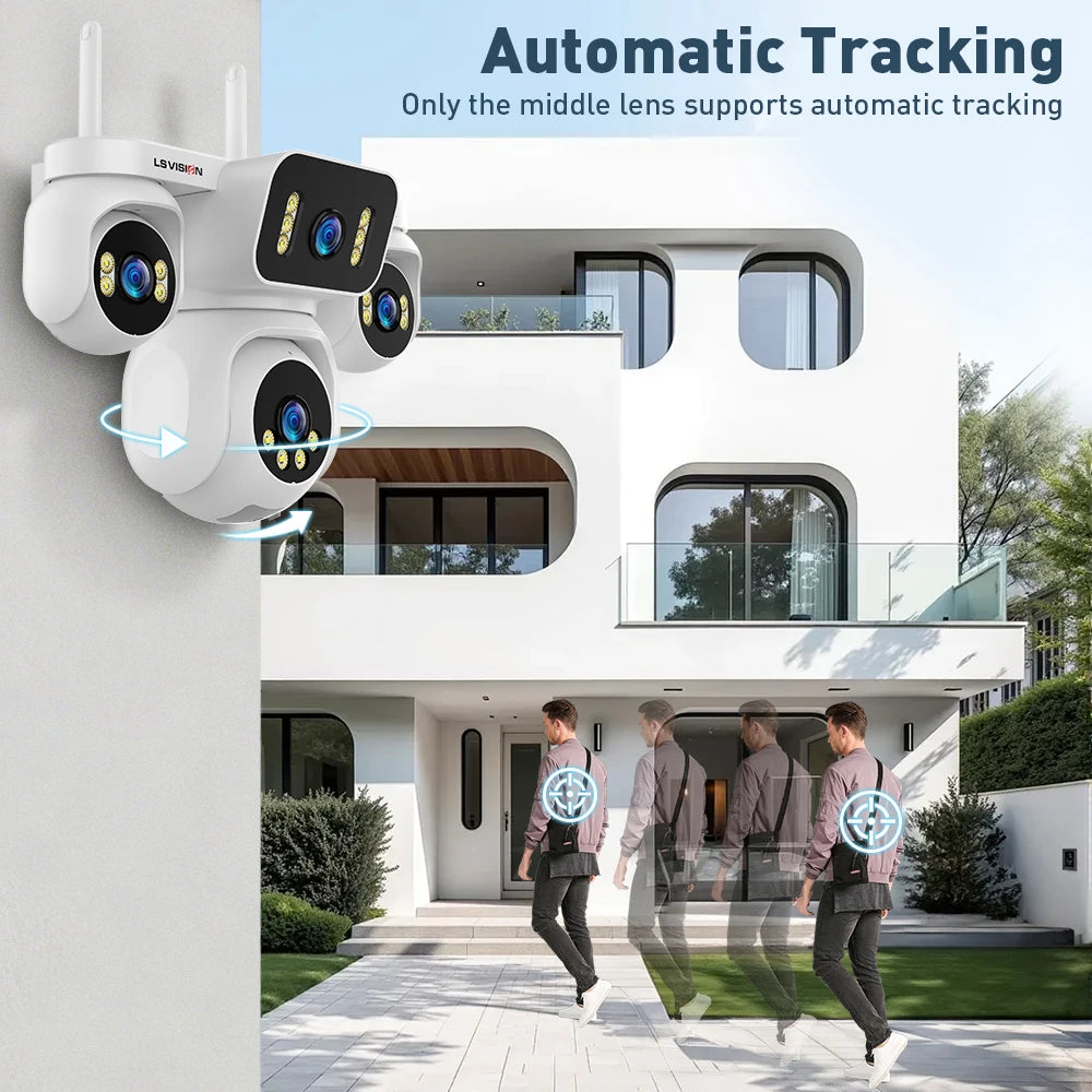 Die Sicherheitskamera verfügt über vier separate 5-Megapixel-Objektive, die zusammen eine beeindruckende Gesamtauflösung von 20 MP bieten. Mit einem 360-Grad-Schwenkbereich und einer Neigung von 0 bis 90 Grad ermöglicht sie eine umfassende Überwachung großer Bereiche. Die Kamera unterstützt Smart Tracking und menschliche Erkennung, was Fehlalarme reduziert und die Sicherheit erhöht. Dank der 16-fachen digitalen Zoomfunktion können Details klar und deutlich erfasst werden.