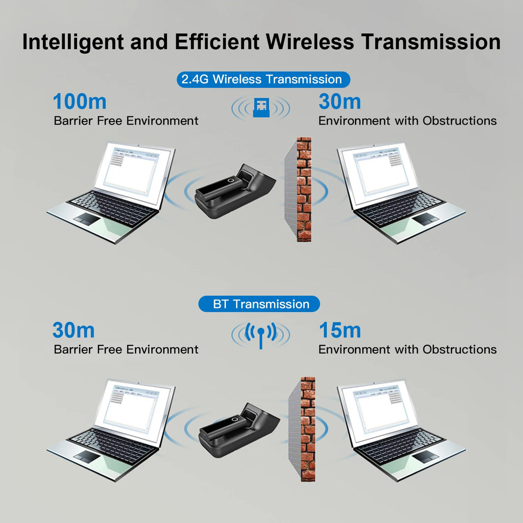 Dieser tragbare 3-in-1 Barcode-Scanner ist die ideale Lösung für den professionellen Einsatz in Einzelhandel, Lagerverwaltung, Logistik und vielen weiteren Bereichen. Er unterstützt das Scannen von 1D-, 2D- und QR-Codes mit hoher Geschwindigkeit und Präzision – auch direkt vom Bildschirm. Dank der Kombination aus Bluetooth, 2,4G Wireless und USB-Verbindung ist maximale Flexibilität bei der Nutzung gegeben. Die kabelgebundene Verbindung wird bei gleichzeitiger Nutzung priorisiert.