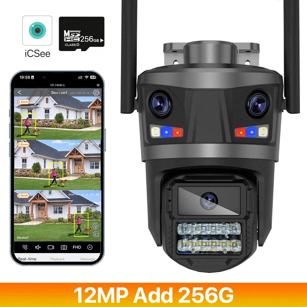 Diese hochwertige Drei-Linsen Außenkamera mit WLAN-Funktion bietet eine beeindruckende Auflösung von 12 Megapixeln und sorgt für eine umfassende Überwachung rund um Ihr Zuhause oder Geschäft. Dank des innovativen Drei-Bildschirm-Designs ermöglicht sie eine gleichzeitige Echtzeitüberwachung aus drei verschiedenen Blickwinkeln – völlig ohne tote Winkel und mit maximaler Detailtiefe.