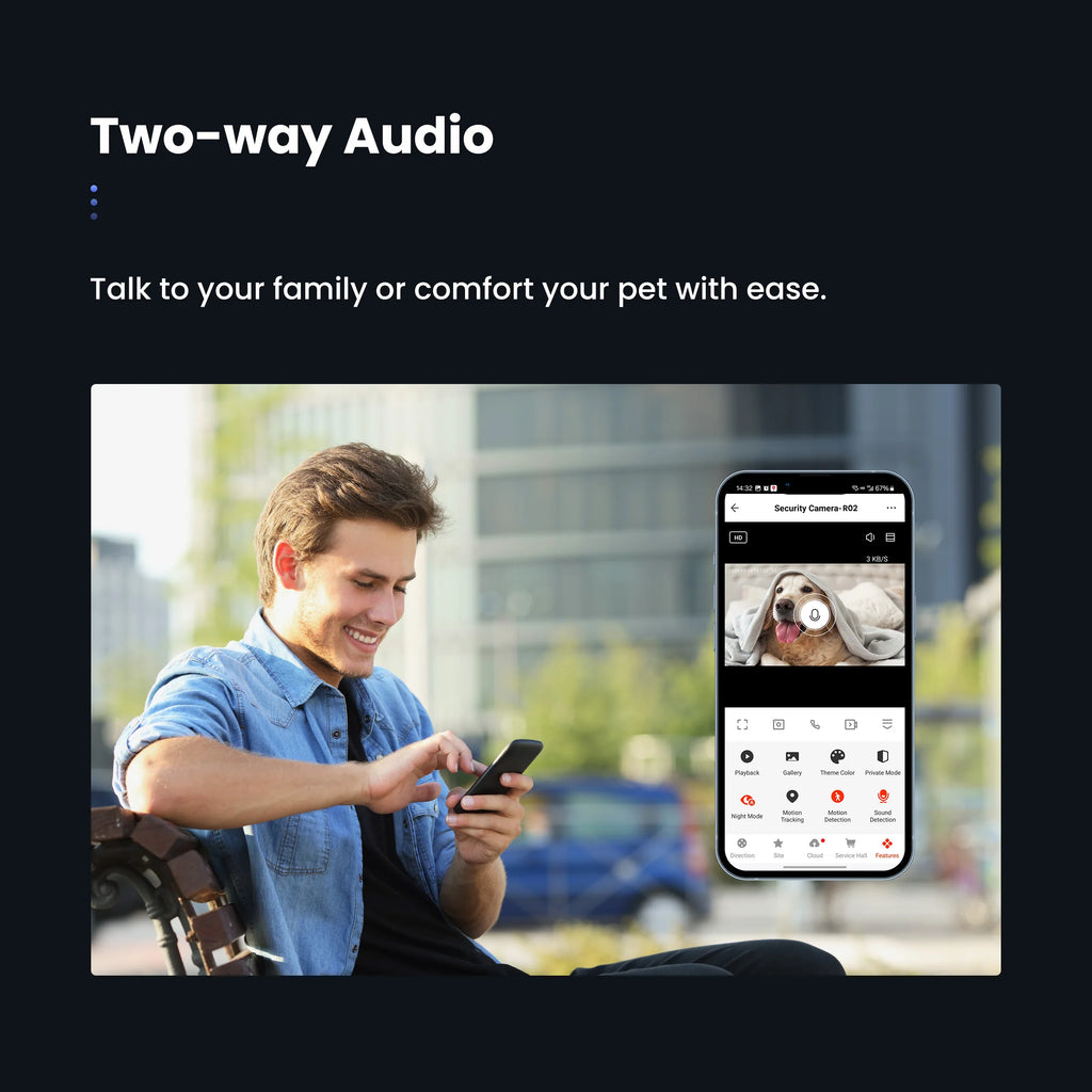 Dank einstellbarer aktiver Zonen können Sie gezielt Bereiche überwachen, die Ihnen am wichtigsten sind. Die Zwei-Wege-Audiofunktion ermöglicht eine direkte Kommunikation über die Kamera – ideal, um mit Ihrem Baby oder Familienmitgliedern zu sprechen, auch wenn Sie nicht im Raum sind.