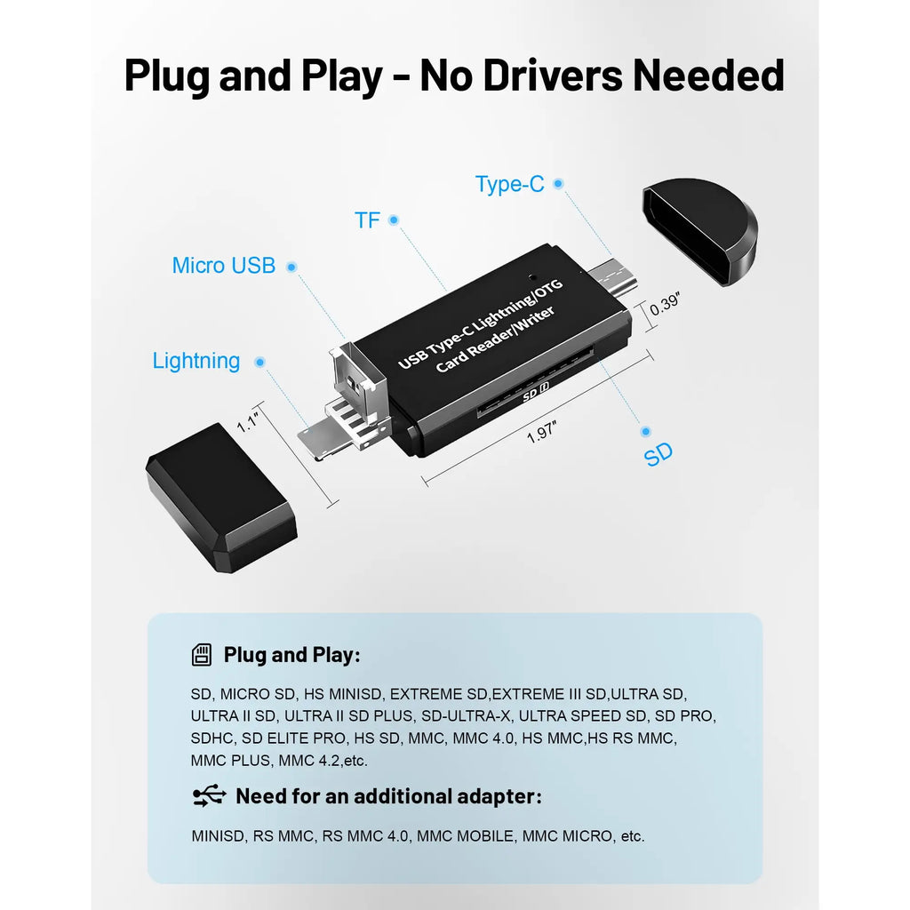 Dieser 4-in-1-SD-Kartenleser bietet schnellen und einfachen Zugriff auf Ihre Dateien unterwegs. Mit integrierten Lightning-, USB-C-, USB-A- und Micro-USB-Anschlüssen ist er mit iPhones, iPads, Android-Geräten mit Typ-C-Anschluss sowie Laptops kompatibel. Zwei Kartenfächer unterstützen SD- und Micro-SD-Karten, was ihn ideal für Fotografen, Drohnenanwender und Content-Ersteller macht.