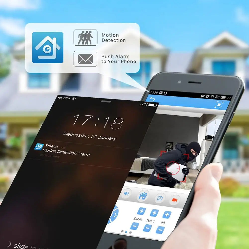 Zur Ausstattung gehören eine Bewegungserkennung mit E-Mail-Benachrichtigung, automatische Tag-/Nachtumschaltung, Gegenlichtkompensation und automatischer Weißabgleich. Die Kamera unterstützt ONVIF 2.0 bis 2.4 für einfache Integration in bestehende Überwachungssysteme. Eine Mehrfachansicht ist über die App XMEye auf iOS- und Android-Geräten oder über die CMS-Software auf Windows-PCs möglich. Fernzugriff über P2P ermöglicht eine komfortable Überwachung von überall.