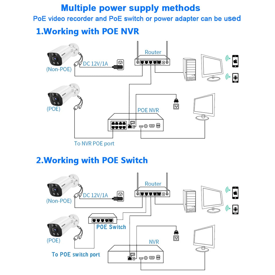 Die Stromversorgung erfolgt über POE (Power over Ethernet), sodass nur ein Netzwerkkabel nötig ist. Die Verarbeitung im Metallgehäuse macht die Kamera vandalismussicher. Das integrierte Sensor‑Modul nutzt Sony CMOS-Technologie für hochwertige Bildqualität.