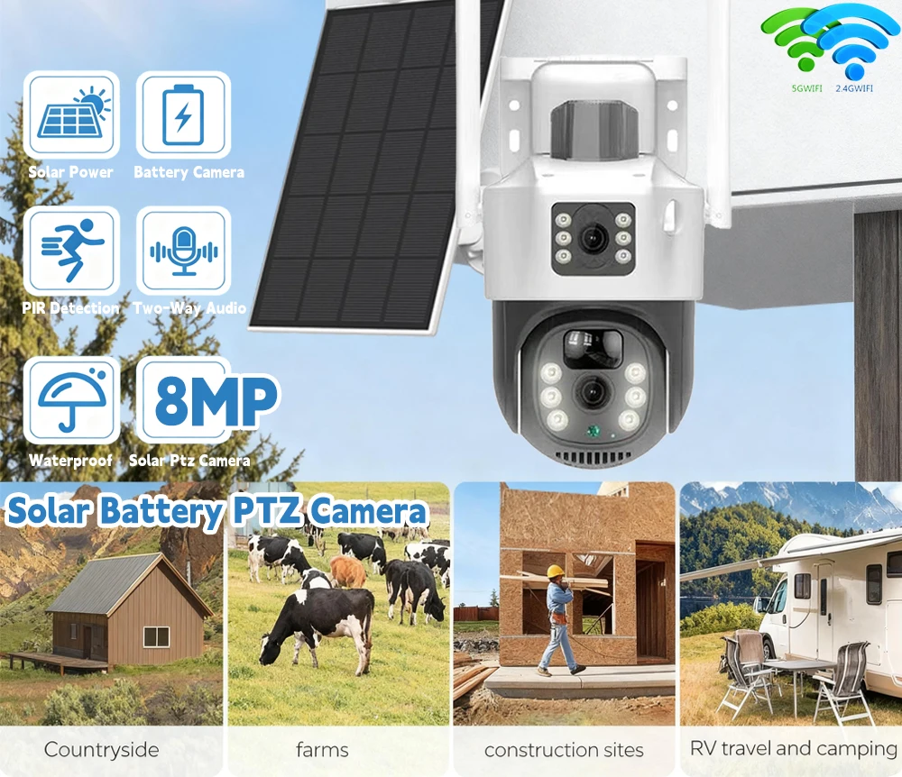 Solar 5G 2,4G WiFi Kamera mit PIR-Erkennung bietet eine hochauflösende 8MP 4K Videoqualität und verfügt über zwei Objektive mit Dual Screen für eine bessere Sicht. Die Kamera unterstützt eine 360° Blickwinkel-Abdeckung und kann horizontal um 355° und vertikal um 90° gedreht werden. Sie ist mit einem PIR-Infrarotsensor ausgestattet, der Bewegungen bis zu 10 Metern erkennt und so Fehlalarme reduziert. Die Stromversorgung erfolgt solarbetrieben über einen eingebauten 18650-Akku mit einer Standby-Zeit von bis zu 365 Tagen, was eine langanhaltende Nutzung ohne häufiges Aufladen ermöglicht.