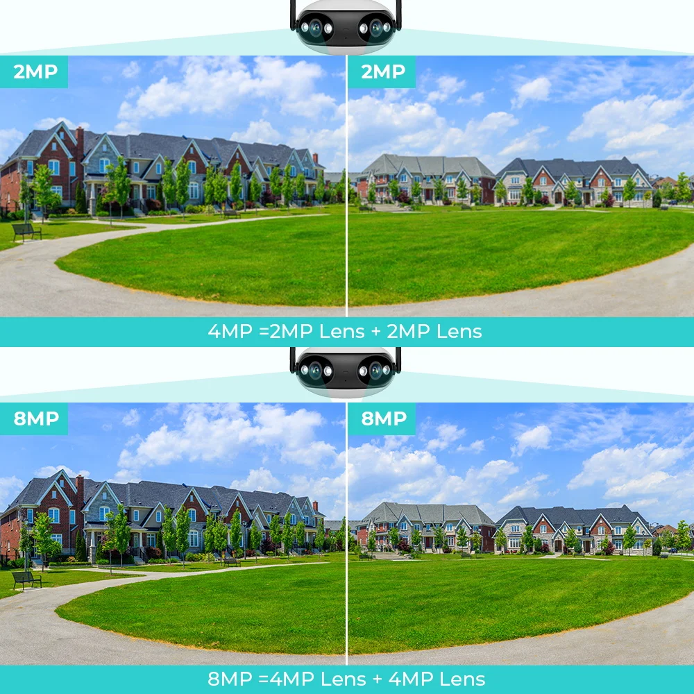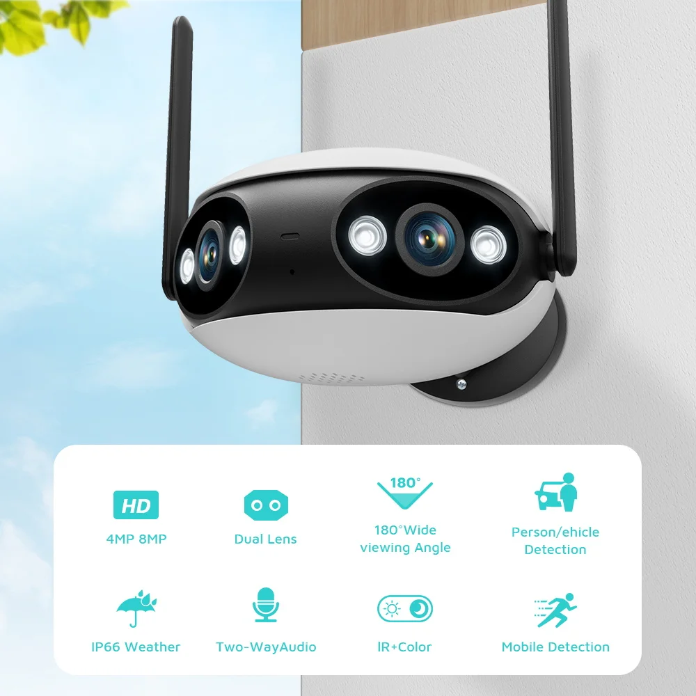 Diese 180-Grad-Ultra-Weitwinkel-Dual-Lens-WIFI-Kamera bietet eine innovative Überwachungslösung für den Innen- und Außenbereich. Mit zwei Objektiven deckt sie einen deutlich größeren Bereich ab als herkömmliche Kameras und ermöglicht eine Panoramaansicht mit minimaler Verzerrung. Die Kamera ist in 4MP und 8MP Versionen erhältlich, wobei jede Linse jeweils 2MP bzw. 4MP liefert, sodass die Gesamtauflösung durch die Dual-Linsen-Technologie erheblich verbessert wird.