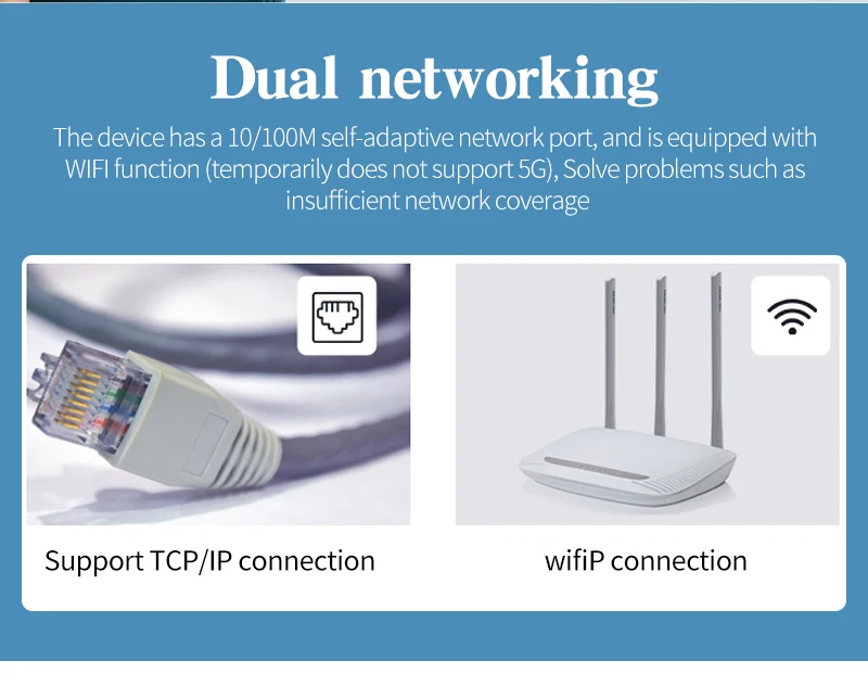 Kommunikation und Anbindung erfolgen über RJ45 (Ethernet), WiFi sowie TCP/IP. Das Gerät kann über LAN oder Cloud‑Software gesteuert werden. Zudem unterstützt es Wiegand-Ausgabe, wodurch es mit vielen Zutrittssteuerungssystemen kompatibel ist.