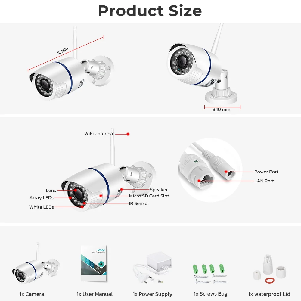 Zur Speicherung von Aufnahmen ist ein Micro-SD-Karten-Slot vorhanden, der Karten mit bis zu 64 GB unterstützt. So können Sie Videos direkt auf der Kamera sichern und bei Bedarf über die kompatible iCSee-App auf iOS- und Android-Geräten bequem abrufen und verwalten. Die Kamera unterstützt außerdem ONVIF für eine einfache Integration in bestehende Überwachungssysteme.