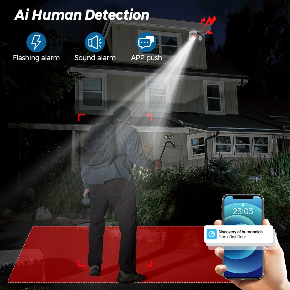 Die Kamera verfügt über eine Infrarot-Nachtsicht mit bis zu 30 Metern und eine Farbnachtsicht mit bis zu 50 Metern, um auch bei schlechten Lichtverhältnissen klare Bilder zu liefern. Die intelligente Bewegungserkennung mit KI-gestützter humanoider Erkennung sorgt für genaue Alarmmeldungen, wobei Fehlalarme durch Tiere oder andere Objekte reduziert werden. Bei Bewegungserkennung aktiviert die Kamera ein LED-Licht, um potenzielle Eindringlinge abzuschrecken.
