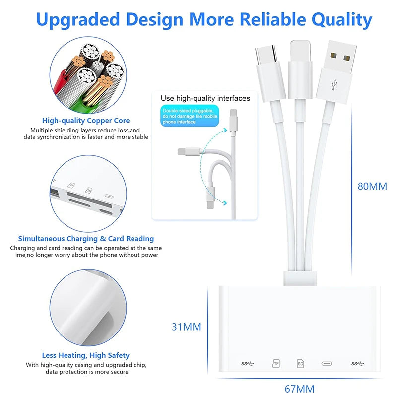 Das Gerät unterstützt gleichzeitiges Lesen und Schreiben von zwei Karten, sodass Sie Dateien einfach sichern, Fotos und Videos archivieren oder zwischen Smartphone, Tablet und PC übertragen können. Dank der integrierten Lightning-Ladefunktion können iPhone und iPad während der Datenübertragung geladen werden, sodass keine Unterbrechung der Arbeit entsteht.
