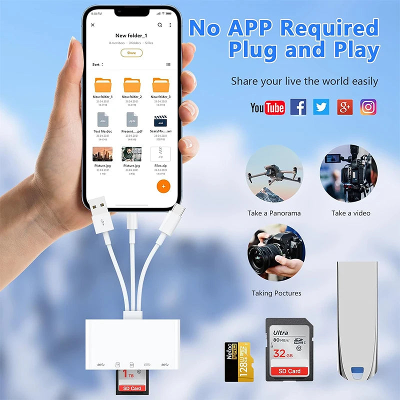 Die schnelle Zwei-Wege-Datenübertragung ist kompatibel mit iOS 13–16, Android OTG und Computern. Unterstützt werden SD, SDHC, SDXC, Micro SD, Micro SDHC, Micro SDXC Karten bis zu 512 GB sowie USB-Laufwerke. Der Adapter ist besonders geeignet für Fotografen, Videografen, Studenten oder alle, die mobile Datensicherung und -verwaltung benötigen.