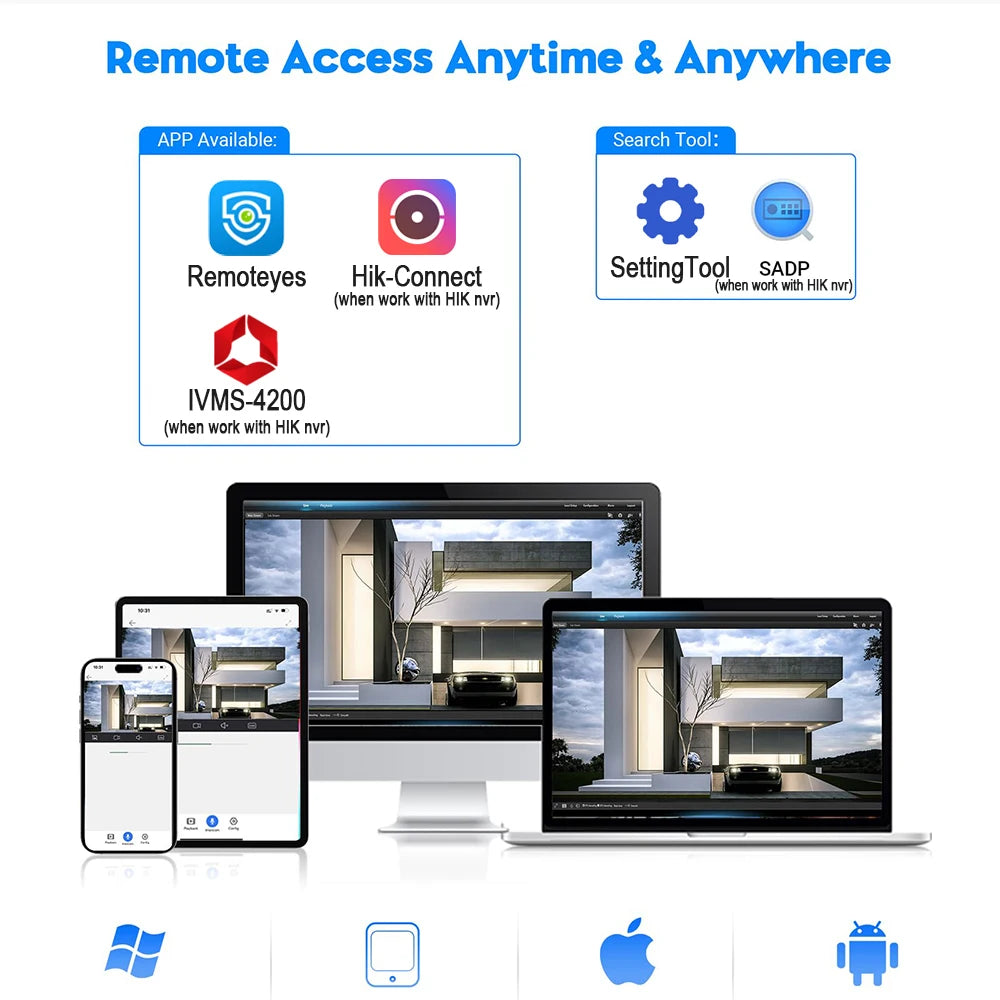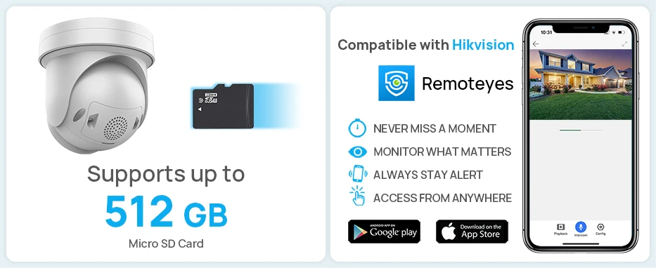 Die eingebauten Mikrofone und Lautsprecher unterstützen die Zwei-Wege-Audiofunktion, sodass Sie über die Kamera direkt mit Personen vor Ort kommunizieren können. Für die Speicherung von Videomaterial ist ein microSD-Kartensteckplatz mit Unterstützung bis zu 512 GB vorhanden, außerdem ist die Kamera kompatibel mit NAS-Systemen.