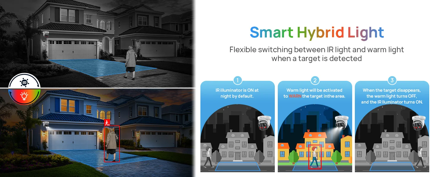 Für die Nachtsicht verfügt die Kamera über einen Hybridbeleuchtungsmodus: Im Normalbetrieb bei Nacht wird die Szene mit Infrarotlicht schwarz-weiß dargestellt. Sobald Bewegung von Menschen oder Fahrzeugen erkannt wird, schaltet die Kamera auf farbige Beleuchtung um, um bessere Details sichtbar zu machen. Nach Verlassen des Bereichs wechselt sie zurück zum Infrarotmodus.