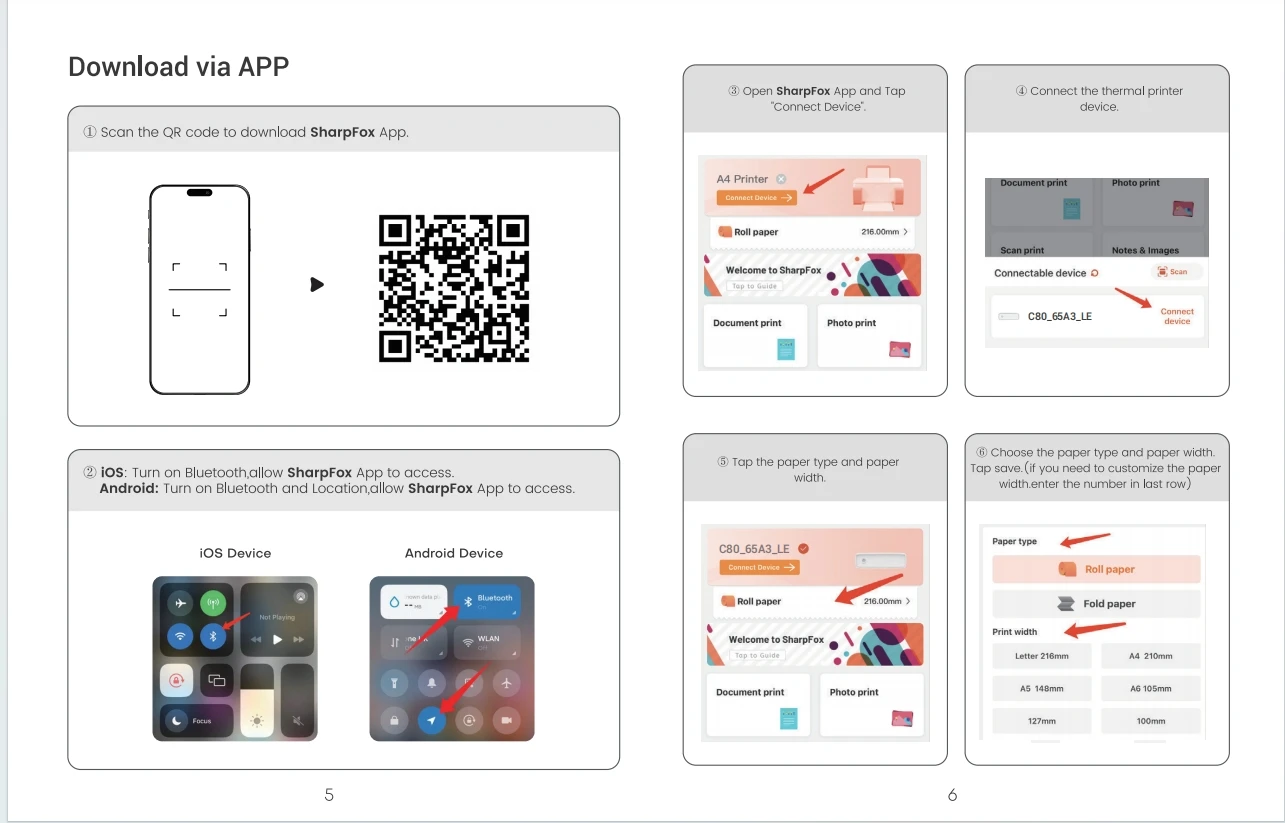 Die „Sharpfox“-App, verfügbar im Google Play Store und Apple App Store, ermöglicht eine einfache und schnelle Verbindung zum Drucker sowie eine benutzerfreundliche Bearbeitung deiner Vorlagen. Einfach die App öffnen, Bluetooth aktivieren, Drucker verbinden – und schon kann gedruckt werden.