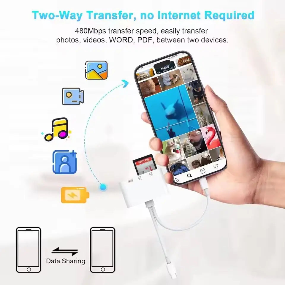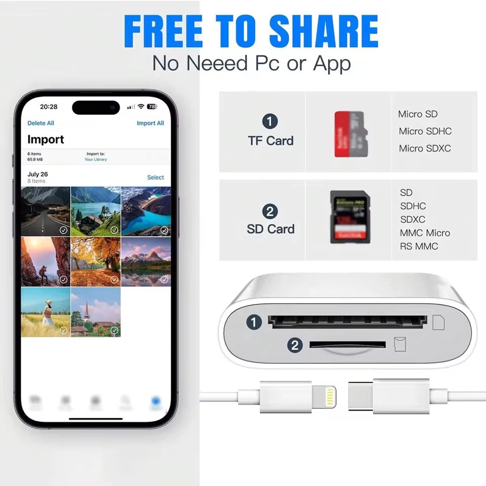 Dual-Port SD TF Kartenleser Lightning & USB-C Adapter für iPhone, iPad, Samsung – Schnelle Datenübertragung
