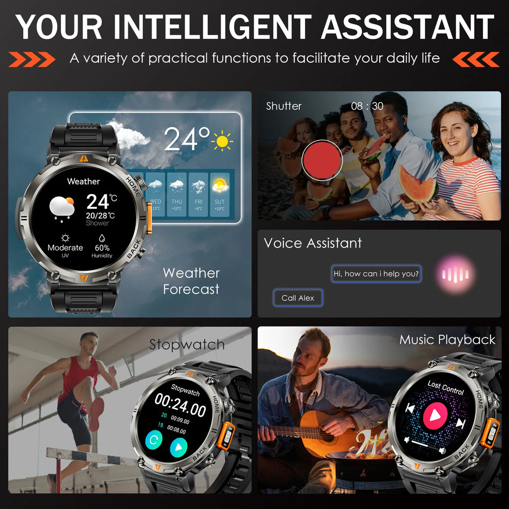 Die Smartwatch ist eine multifunktionale Sportuhr mit einem robusten 3ATM Wasserschutz und über 100 Sportmodi, speziell für Männer entwickelt. Das 1,45 Zoll große TFT-Touchdisplay mit 360x360 Pixeln sorgt für eine klare und brillante Anzeige, die auch bei direkter Sonneneinstrahlung gut ablesbar ist. Ausgestattet mit einem leistungsstarken MediaTek Prozessor und Bluetooth 5.2 bietet die Uhr nahtlose Konnektivität zu Android- und iOS-Geräten.