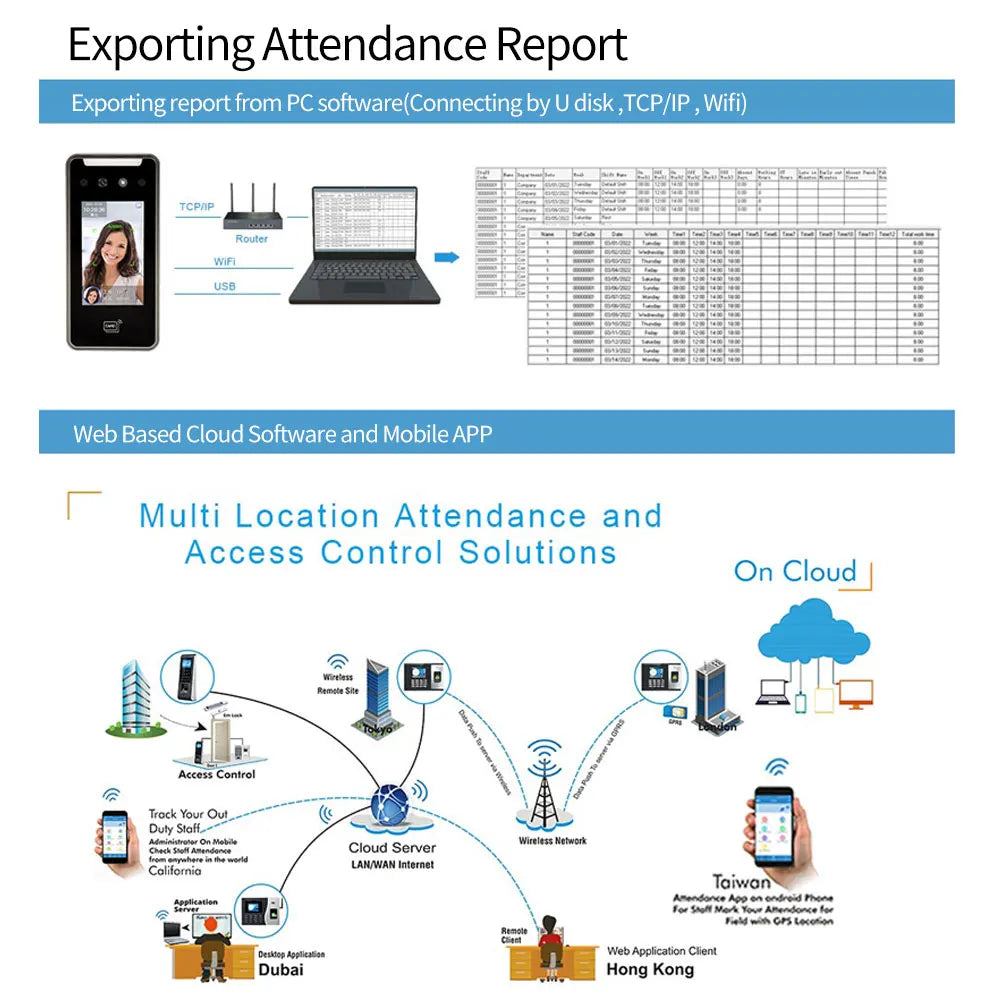 Für die Kommunikation unterstützt das Gerät TCP/IP, WLAN, USB und eine Schnittstelle für Zugangskontrolle (Sperrausgang, Türklingelausgang/Alarm, Weigand Ein-/Ausgang). Die mitgelieferte Software umfasst sowohl lokal installierbare Anwesenheitssoftware als auch eine webbasierte Cloud‑Software, ohne zusätzliche Lizenzkosten.
