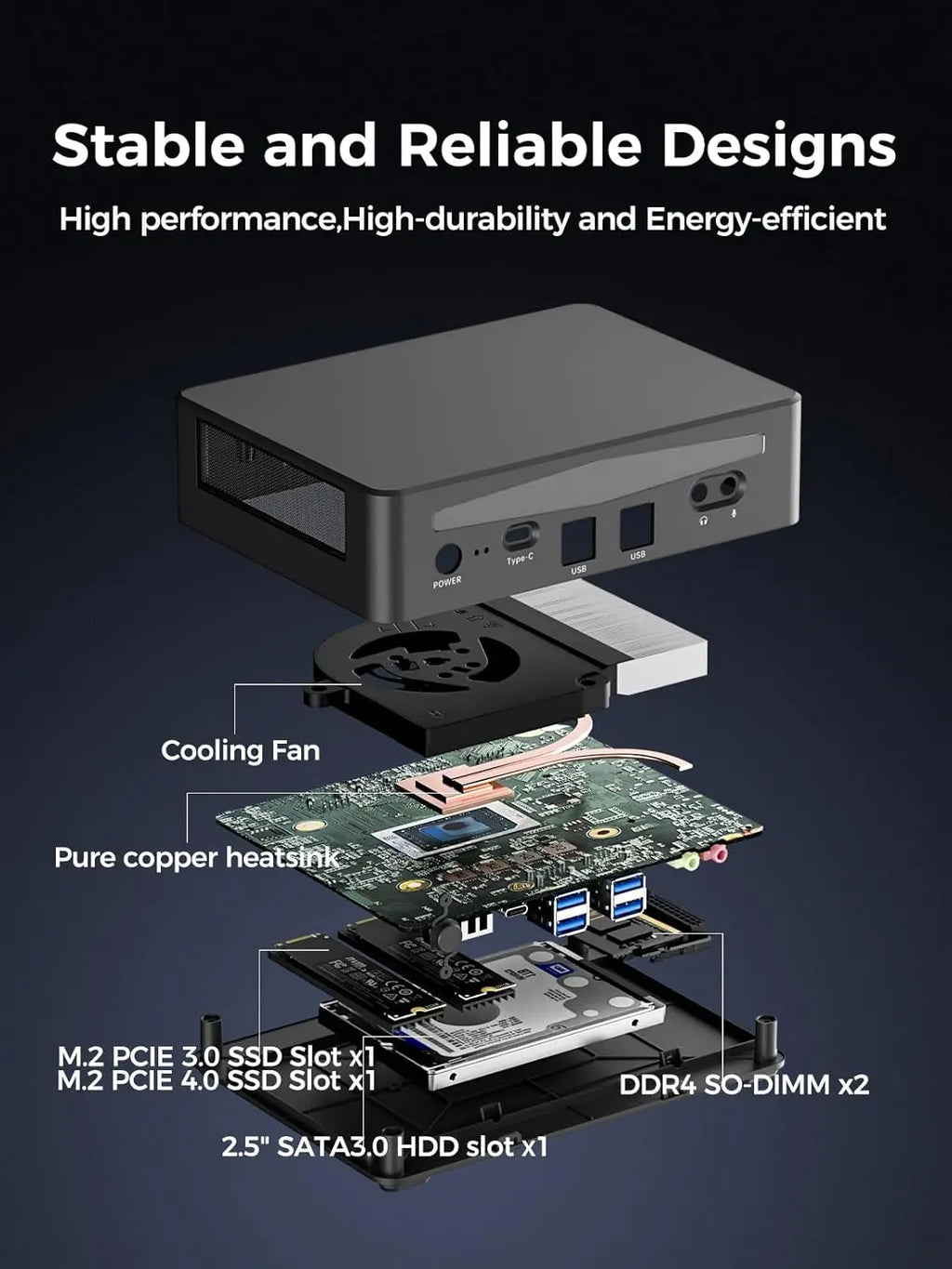 Der leistungsstarke Desktop-Mini-PC unterstützt bis zu 64 GB DDR4 RAM, verfügt über zwei M.2 SSD-Steckplätze (inkl. PCIE 4.0 mit bis zu 7000 MB/s Leseleistung) sowie einen 2,5-Zoll-SATA-Slot für zusätzliche Speicherkapazität.