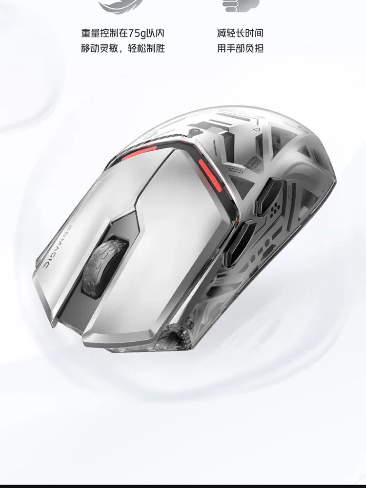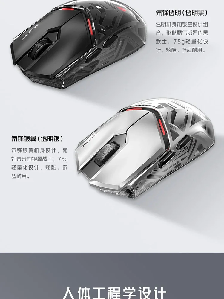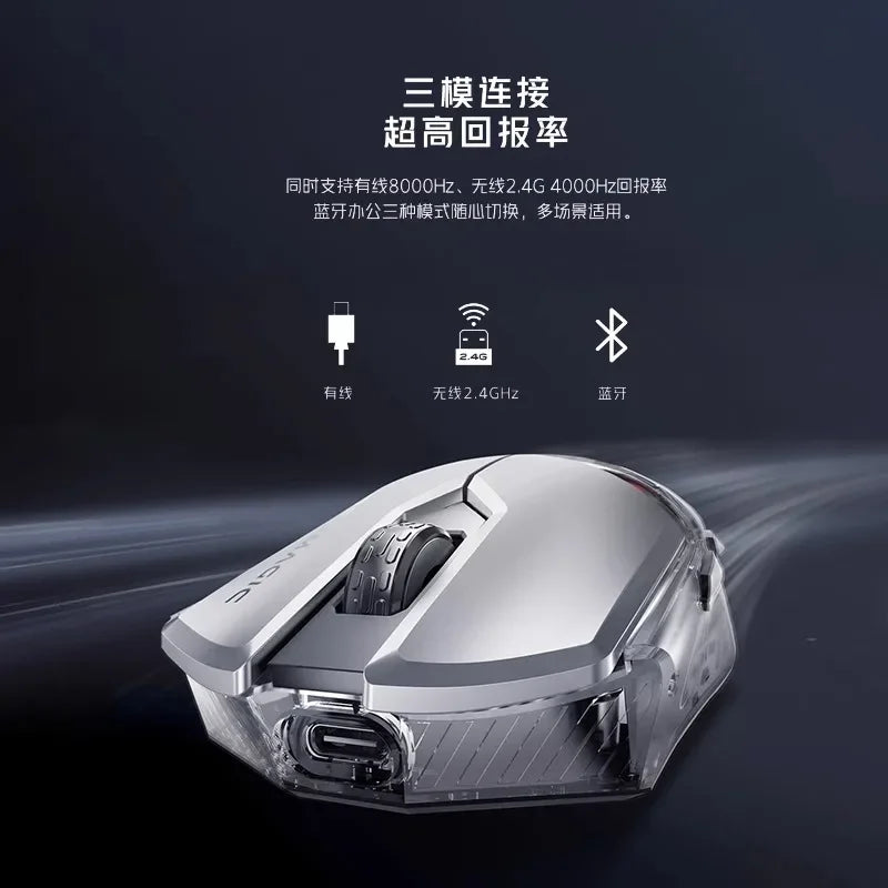 Diese kabellose Gaming-Maus bietet eine präzise Steuerung dank des fortschrittlichen PAW3395 Sensors mit einer optischen Auflösung von 2500 DPI. Sie unterstützt einen Dual-Modus mit einer hohen Abtastrate von 4000 Hz im Kabelbetrieb und 8000 Hz im kabellosen Modus für schnelle und verzögerungsfreie Reaktionen. Die Maus verfügt über fünf Tasten und ein Scrollrad, die individuell anpassbar sind und eine komfortable Bedienung ermöglichen.