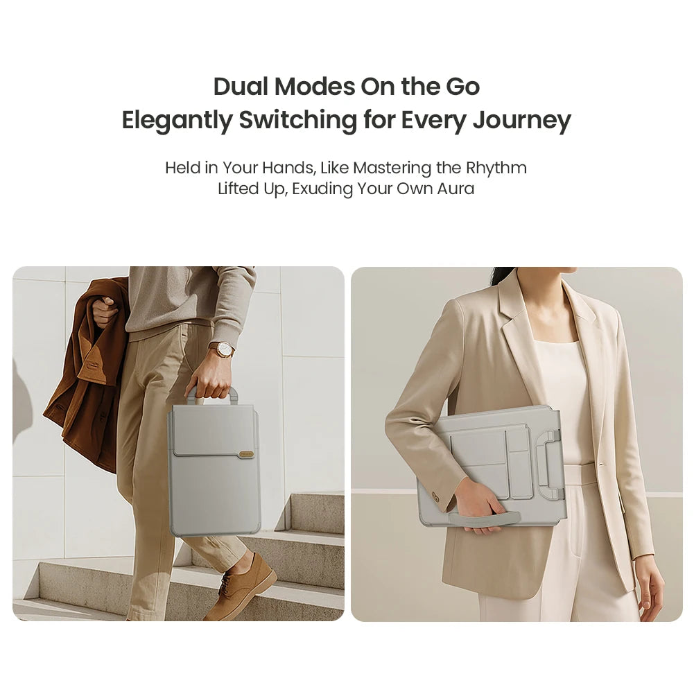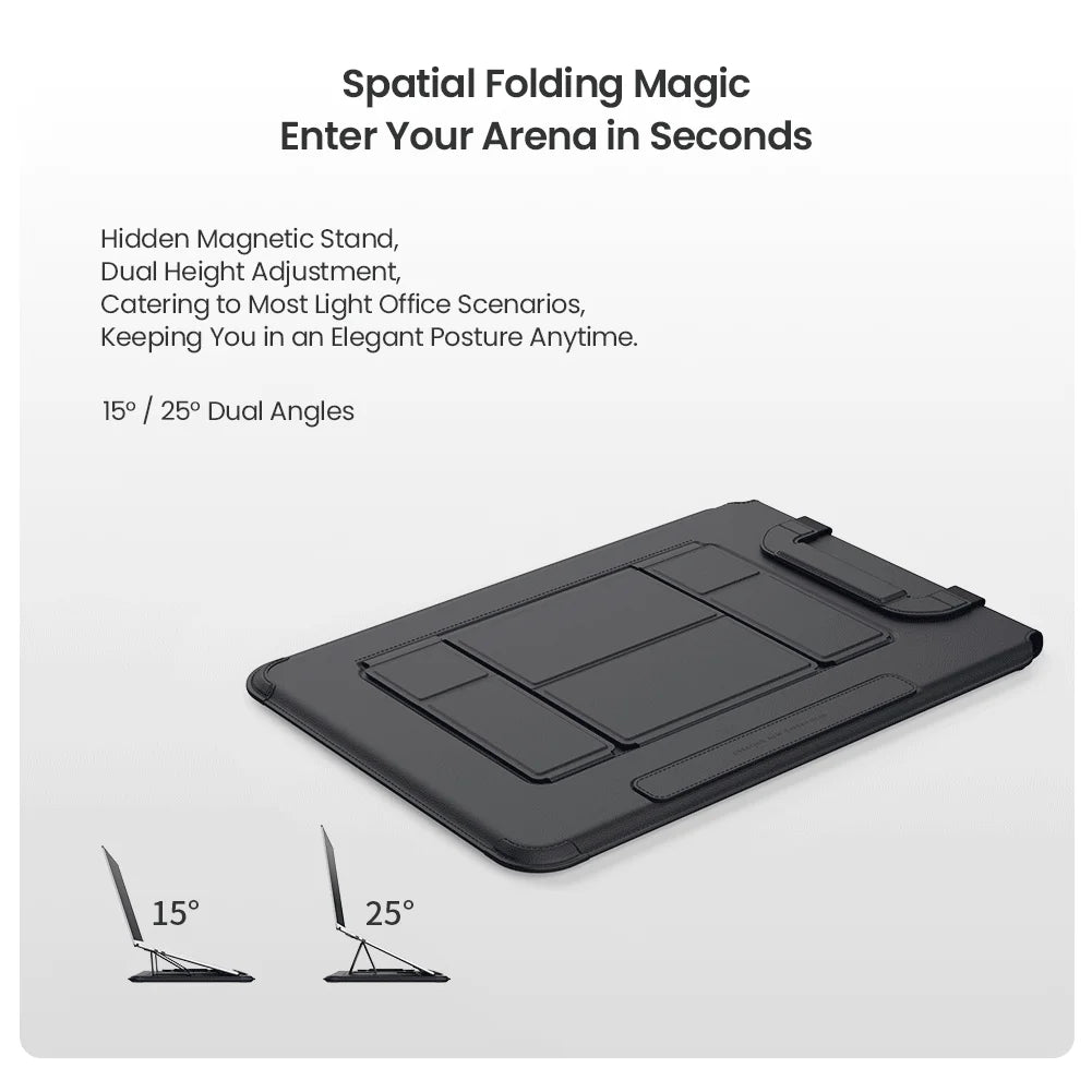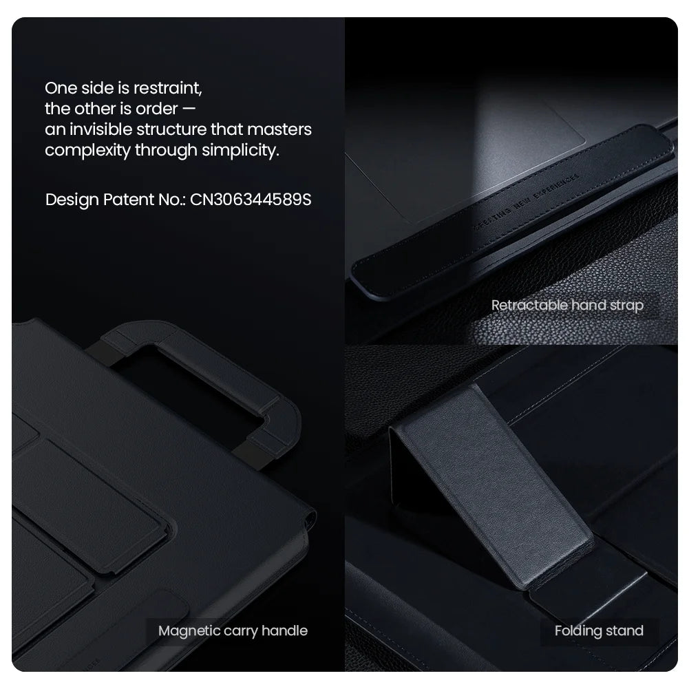 Die Hülle verfügt über einen magnetischen Griff für einfache Ein-Klick-Aufbewahrung und eine praktische Handschlaufe, die doppelt verwendet werden kann, entweder als zusätzlicher Halt oder als Kartenhalter. Dank des doppelten Klettverschlusses ist das Öffnen und Schließen stabil und sicher, selbst bei Laptops unterschiedlicher Dicke.