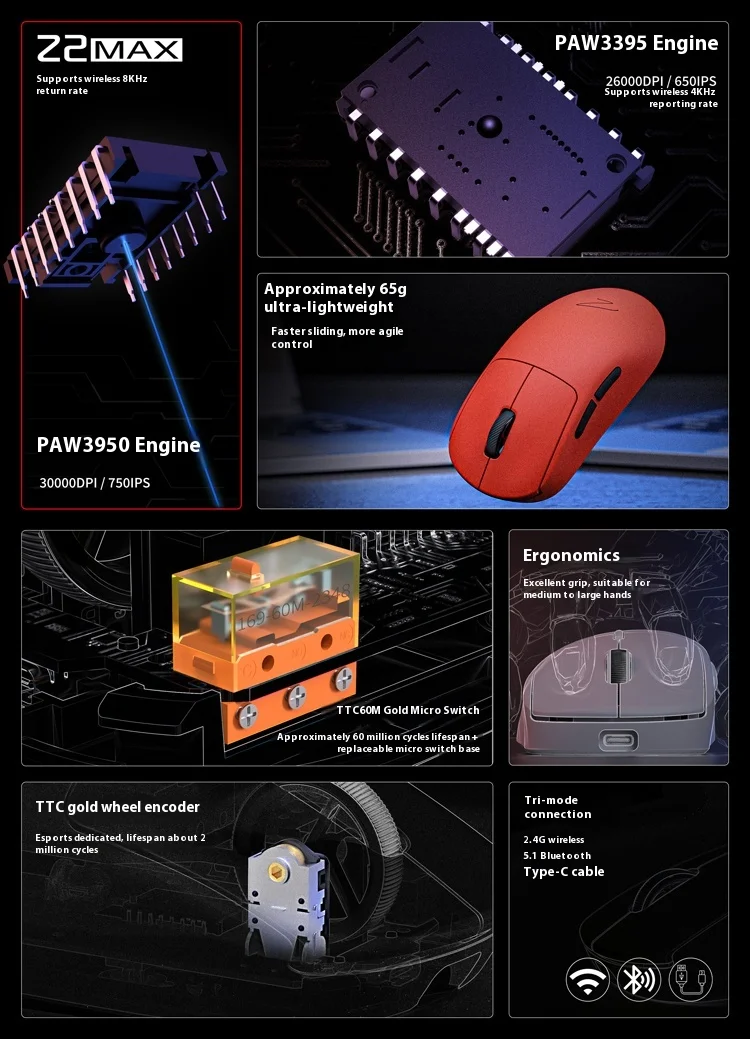Das ergonomische Design passt sich sowohl der rechten als auch der linken Hand an und sorgt so für langanhaltenden Komfort bei intensiven Gaming-Sessions. Das leichte Gehäuse mit nur 65 g ermöglicht schnelle und präzise Bewegungen ohne Ermüdungserscheinungen.