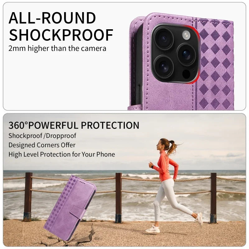 Das schlanke, geometrische Design verleiht der Hülle ein modernes und minimalistisches Aussehen. Die magnetische Klappe sorgt dafür, dass das Gerät sicher verschlossen bleibt, während Anti-Fingerprint und Anti-Scratch Eigenschaften das Telefon sauber und kratzfrei halten. Die Dual-Schicht-Konstruktion bietet zusätzlichen Schutz vor Stößen und Stürzen.