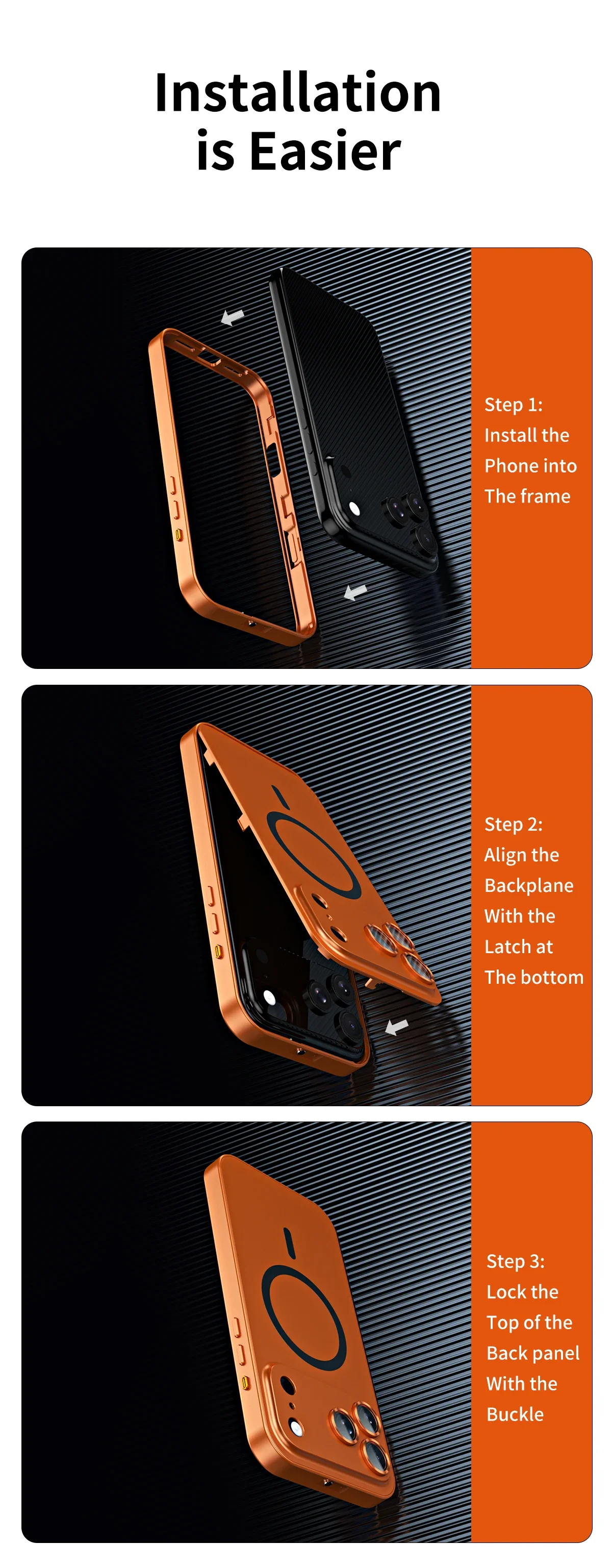 Die Hülle ist präzise gefertigt, sodass alle Anschlüsse, Tasten und Kamerafunktionen problemlos zugänglich bleiben. Dank des leichten, langlebigen Materials ist die Hülle angenehm in der Handhabung und ideal für den täglichen Gebrauch. Die Kombination aus Aluminiumlegierung und Magnetverschluss bietet sowohl Schutz als auch Stil, sodass Ihr iPhone perfekt gesichert ist.