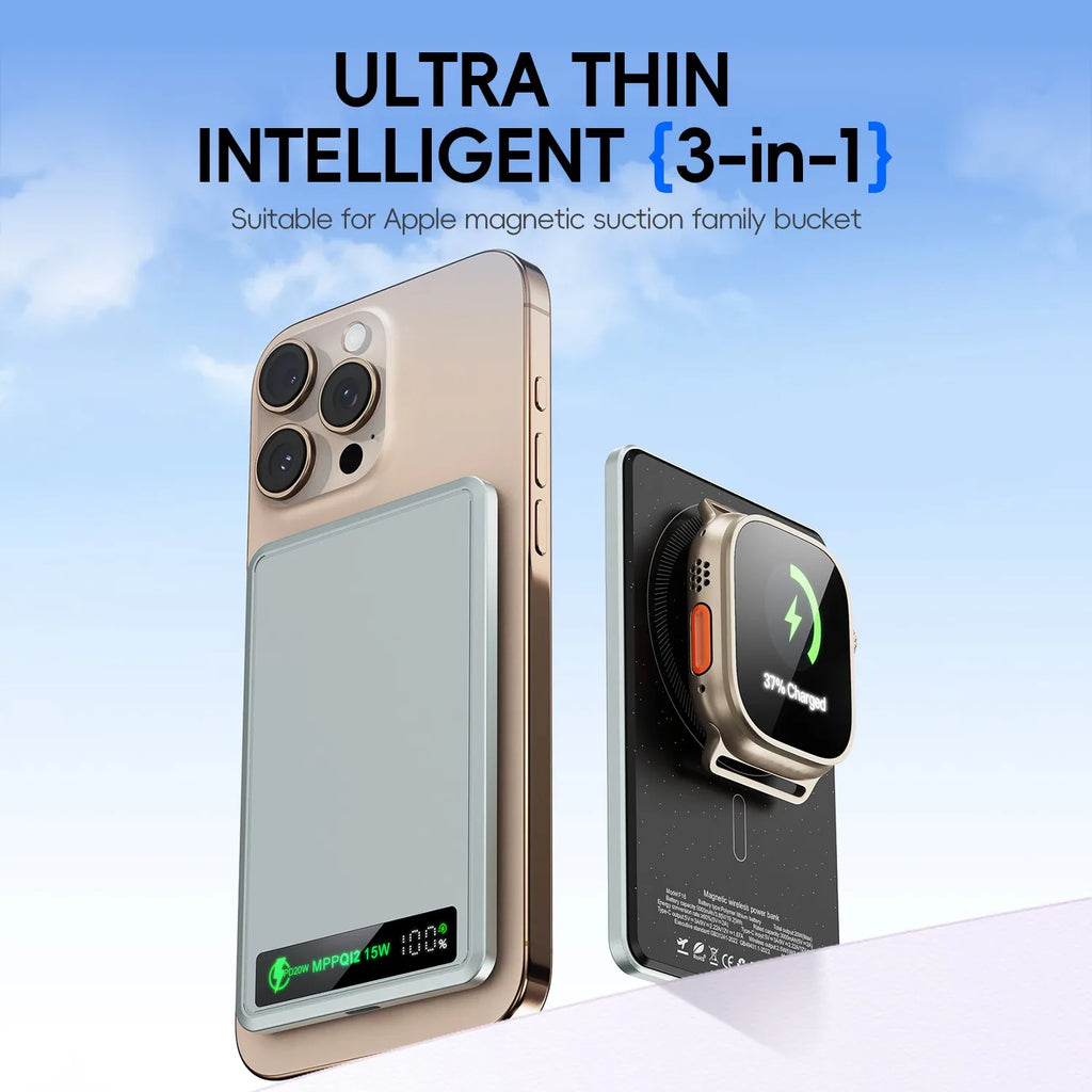 Die ferising Ultra Thin Magnetic Powerbank ist eine kompakte und leistungsstarke tragbare Energiequelle mit 5.000 mAh oder 10.000 mAh Kapazität. Sie ist kabellos, magnetisch und speziell für Apple-Geräte wie iPhone 12–16, Apple Watch Modelle 3–10 sowie andere Smartphones von Samsung und Xiaomi konzipiert.