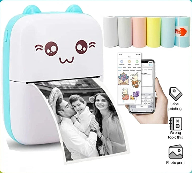 Der Mini Thermodrucker mit Katzenmotiv ist ein kompakter, tragbarer Foto- und Etikettendrucker, ideal für das persönliche Arbeitsmanagement und den mobilen Einsatz. Er druckt über Bluetooth mit einer Geschwindigkeit von bis zu 20 PPM und einer Auflösung von 203 dpi auf Thermopapier mit einer maximalen Breite von 50 mm. Der Drucker benötigt weder Tinte noch Doppel­druck, sondern arbeitet mit einfachem Walzenvorschub.