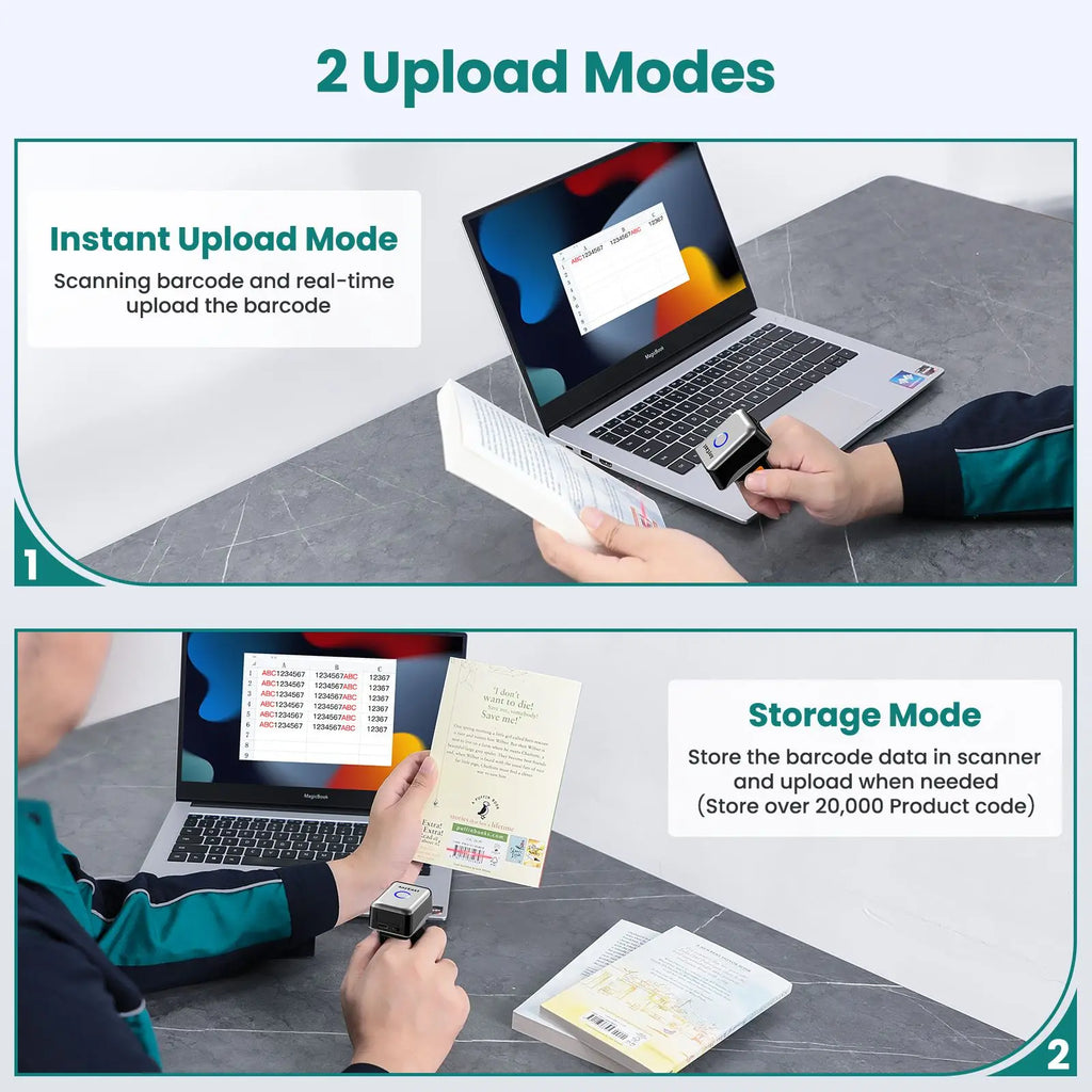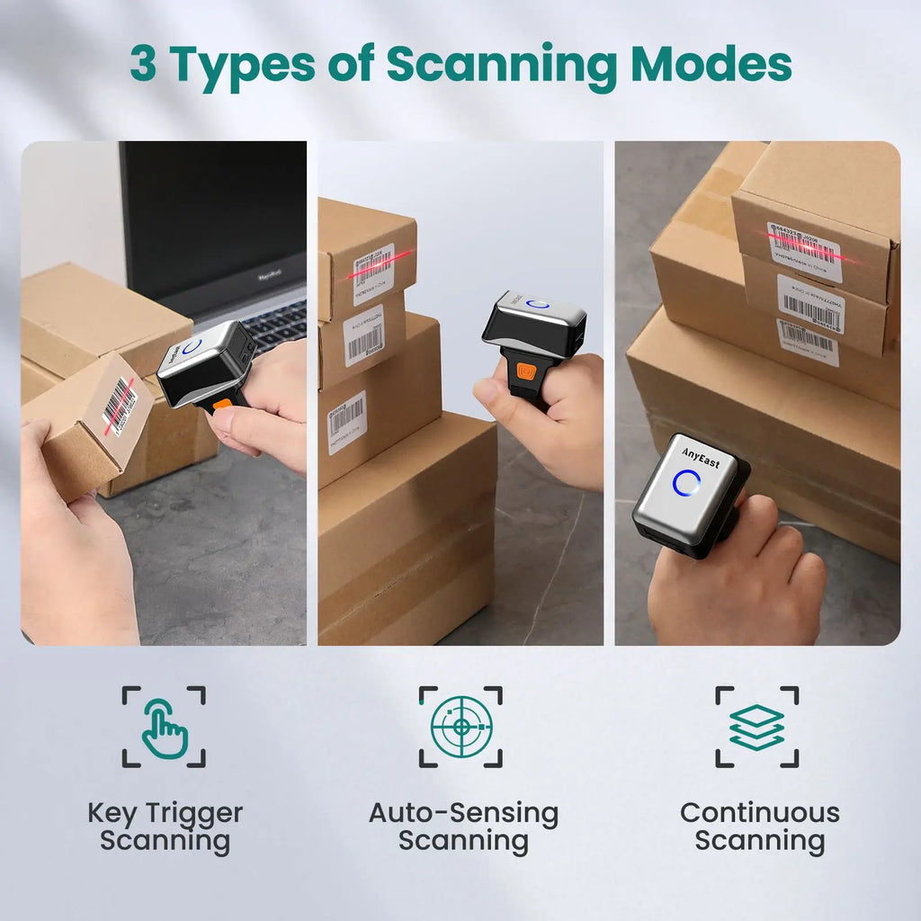 Der Scanner dekodiert zuverlässig 1D‑Barcodes wie EAN‑13, UPC‑A, Code 128, Code 39 u.v.m. Auch schwierige Codes wie beschädigte, reflektierende oder unscharfe Barcodes erkennt er präzise. Der Ring‑Scanner unterstützt drei Scanmodi: Trigger, Auto‑Sensing und kontinuierliches Scannen. Im Speicher‑Modus speichert er bis zu 20 000 Codes, die später aufs Gerät hochgeladen werden können.