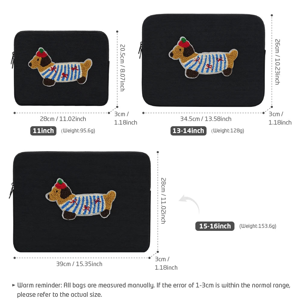 Hergestellt aus hochwertigem Polyester, bietet die Hülle leichten, aber zuverlässigen Schutz vor Kratzern, Staub und leichten Stößen. Das Cartoon-Wursthund-Design sorgt für ein einzigartiges, verspieltes Aussehen, das besonders bei jungen Erwachsenen und Schülern beliebt ist. Der Reißverschluss gewährleistet, dass der Laptop sicher verstaut ist und nicht herausfallen kann.