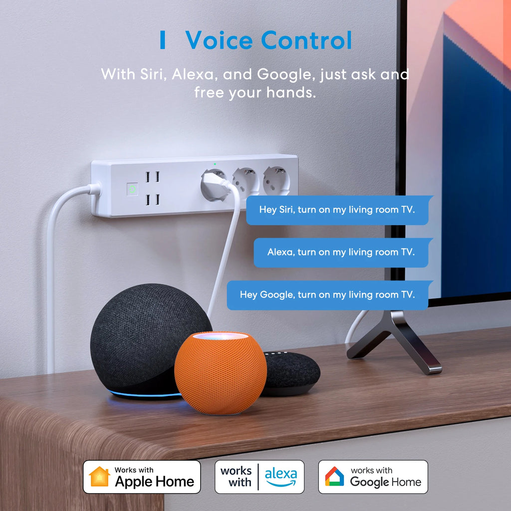 Der smarte Wi-Fi Überspannungsschutz mit 3 Steckdosen und 4 USB-Anschlüssen ist ideal für den Einsatz zu Hause oder im Büro. Jede Steckdose sowie die vier USB-Ports lassen sich bequem von überall aus über die passende App steuern. Die Steckdosenleiste ist kompatibel mit Apple HomeKit, Amazon Alexa, Google Assistant und SmartThings, sodass Sie Ihre Geräte per App oder Sprachbefehl ein- und ausschalten können.