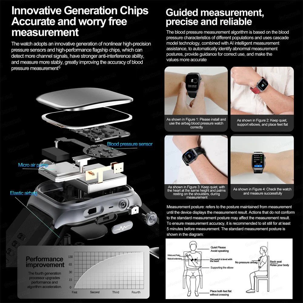 Die Smartwatch verfügt über eine innovative Luftdruckmanschette im Armband zur besonders präzisen Messung von Herzfrequenz und Blutdruck. Zusätzlich überwacht sie Blutsauerstoff, Körpertemperatur, Schlafqualität, Stresslevel, Atemfrequenz, Blutlipide und Harnsäurewerte – ideal für eine ganzheitliche Gesundheitskontrolle im Alltag.