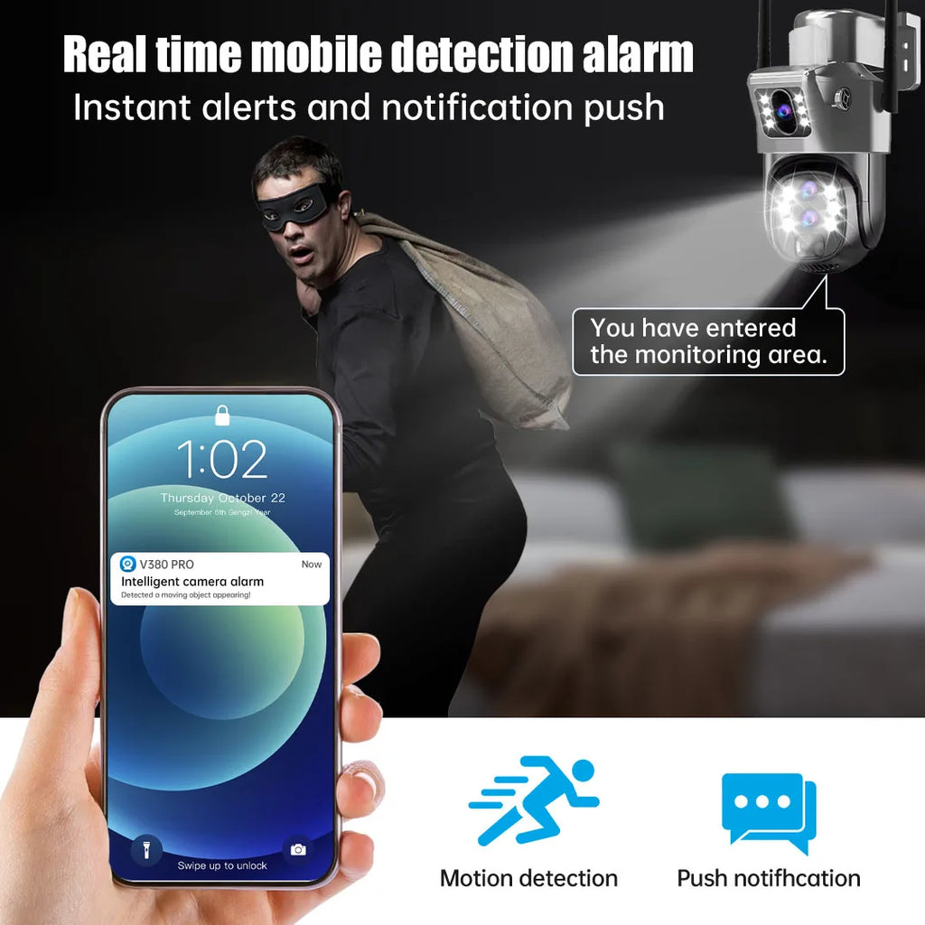 Das integrierte 8-Watt-Solarpanel mit 1,8 Meter Verlängerungskabel sorgt für eine nachhaltige Stromversorgung über den eingebauten 10800-mAh-Akku, was eine lange Betriebsdauer ohne externe Stromquelle garantiert. Die Kamera ist mit der V380 Pro App kompatibel und kann durch Einlegen einer 4G SIM-Karte aus der Ferne gesteuert und überwacht werden. Sie unterstützt bidirektionales Audio, sodass Sie jederzeit mit Personen vor der Kamera kommunizieren können.