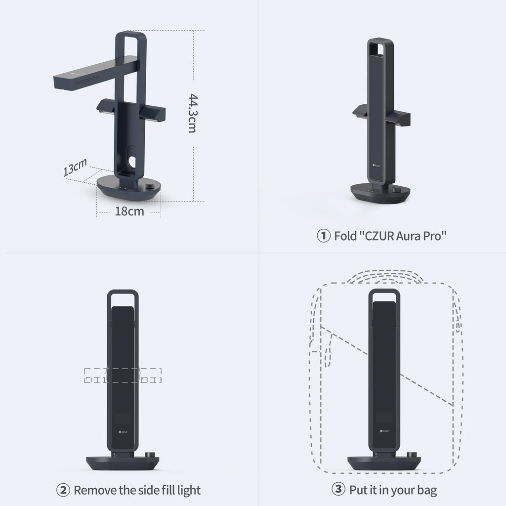 Das kompakte, tragbare Design ermöglicht eine einfache Handhabung und Aufbewahrung, mit Abmessungen von 372 x 180 x 443 mm im geöffneten Zustand und 180 x 130 x 443 mm im zusammengeklappten Zustand. Mit nur 1,5 kg Gewicht ist der Scanner leicht zu transportieren und ideal für mobile Anwendungen.