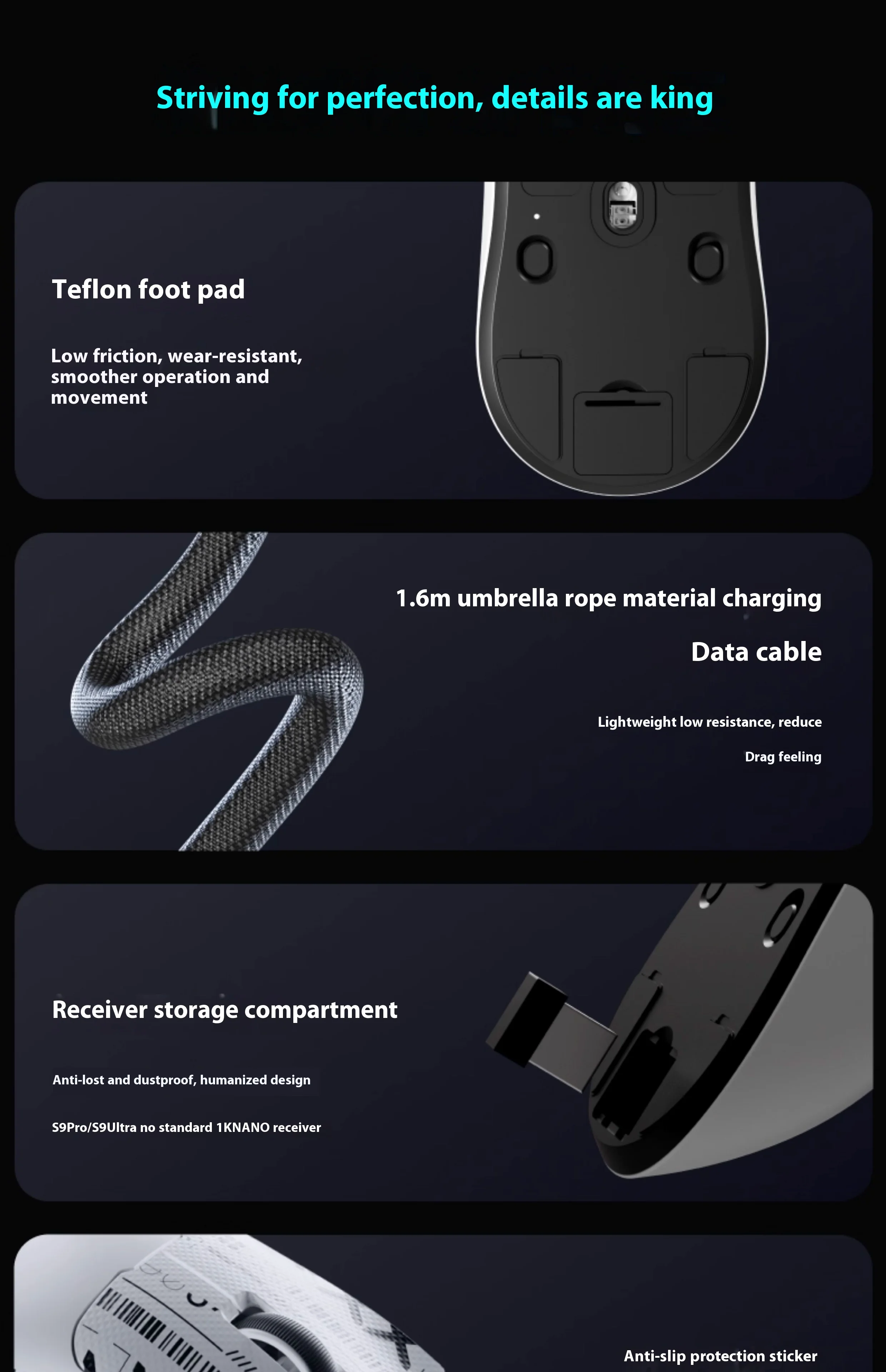 Das ergonomische Design sorgt für eine komfortable Handhabung auch bei langen Nutzungssitzungen, während das leichte Gehäuse die Ermüdung der Hand reduziert. Die vier programmierbaren Tasten ermöglichen eine individuelle Anpassung der Funktionen, um den eigenen Bedürfnissen gerecht zu werden. Die integrierte wiederaufladbare Batterie bietet langanhaltende Leistung, sodass ein ständiger Batteriewechsel entfällt.