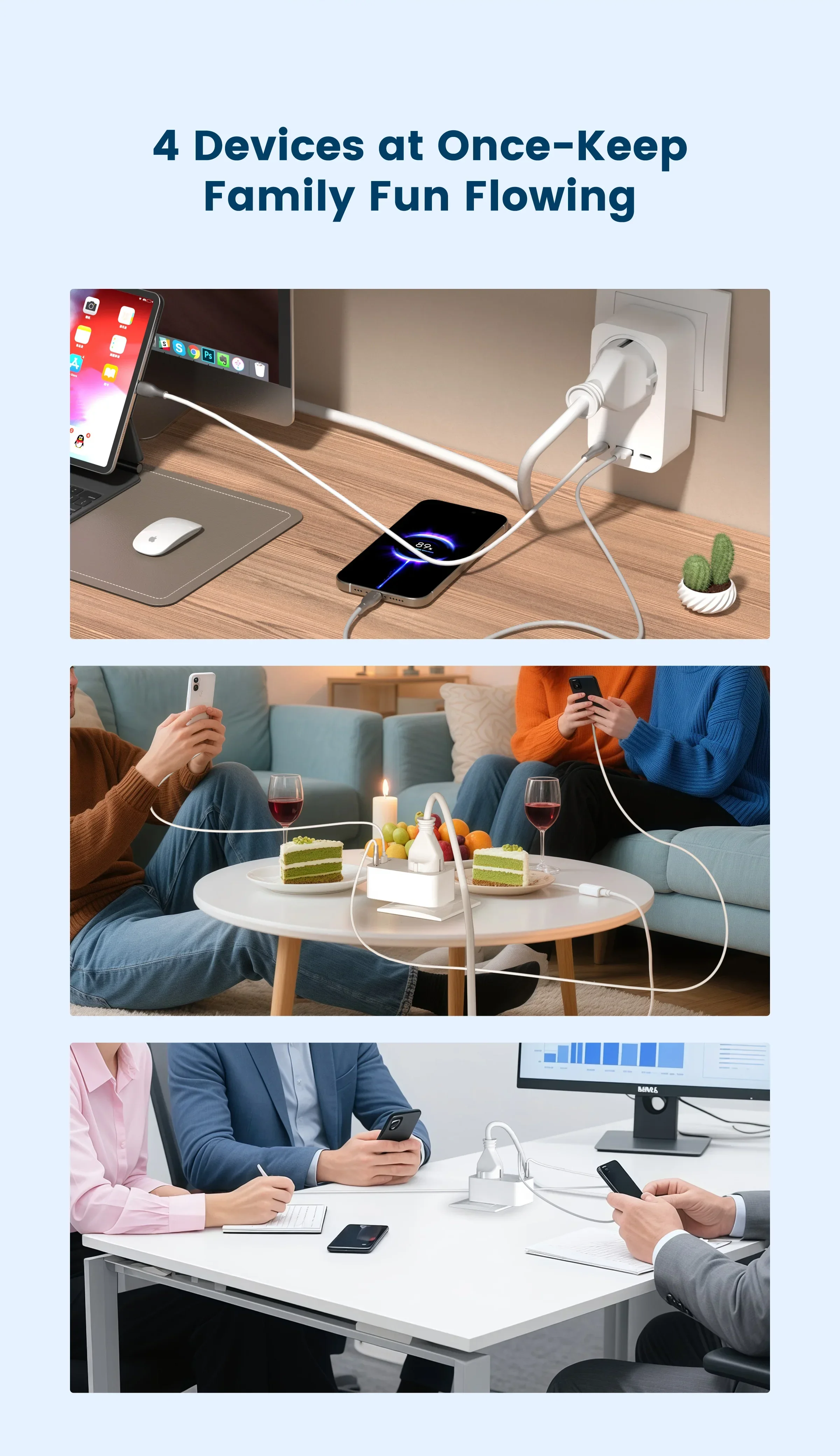Mit USB-C, USB-A und Standard-AC-Steckdose (EU/FR/UK/US-Versionen verfügbar) können Smartphones, Tablets, Laptops und weitere Geräte gleichzeitig geladen werden. So lassen sich MacBook, iPhone und Smartwatch gleichzeitig laden, ohne mehrere Adapter zu benötigen.