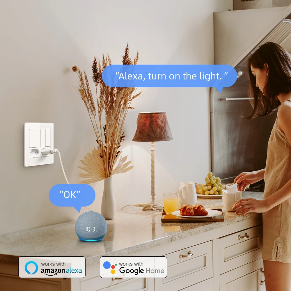 Dieser 4x4 WLAN Smart Schalter mit integrierter Steckdose bietet volle Kontrolle über Ihr Zuhause. Über die Smart Life oder Tuya App können Sie Ihre Beleuchtung und angeschlossene Geräte jederzeit und überall steuern. Kompatibel mit Alexa, Google Home und Yandex Alice für bequeme Sprachsteuerung.