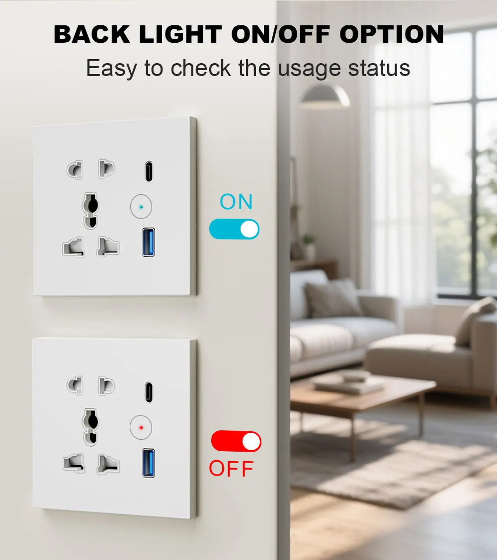 Die Steckdose ist für die Wandmontage vorgesehen und im quadratischen Design gefertigt. Sie besteht aus hochwertigem Kunststoff und erfüllt die Sicherheitsanforderungen nach CE- und RoHS-Zertifizierung. Mit IP21-Schutzklasse ist sie gegen feste Fremdkörper über 12 mm und vertikal fallendes Wasser geschützt, wodurch sie sich für den Innenbereich eignet. Die integrierte Hintergrundbeleuchtung zeigt den Betriebsstatus an und erleichtert die Nutzung im Dunkeln.
